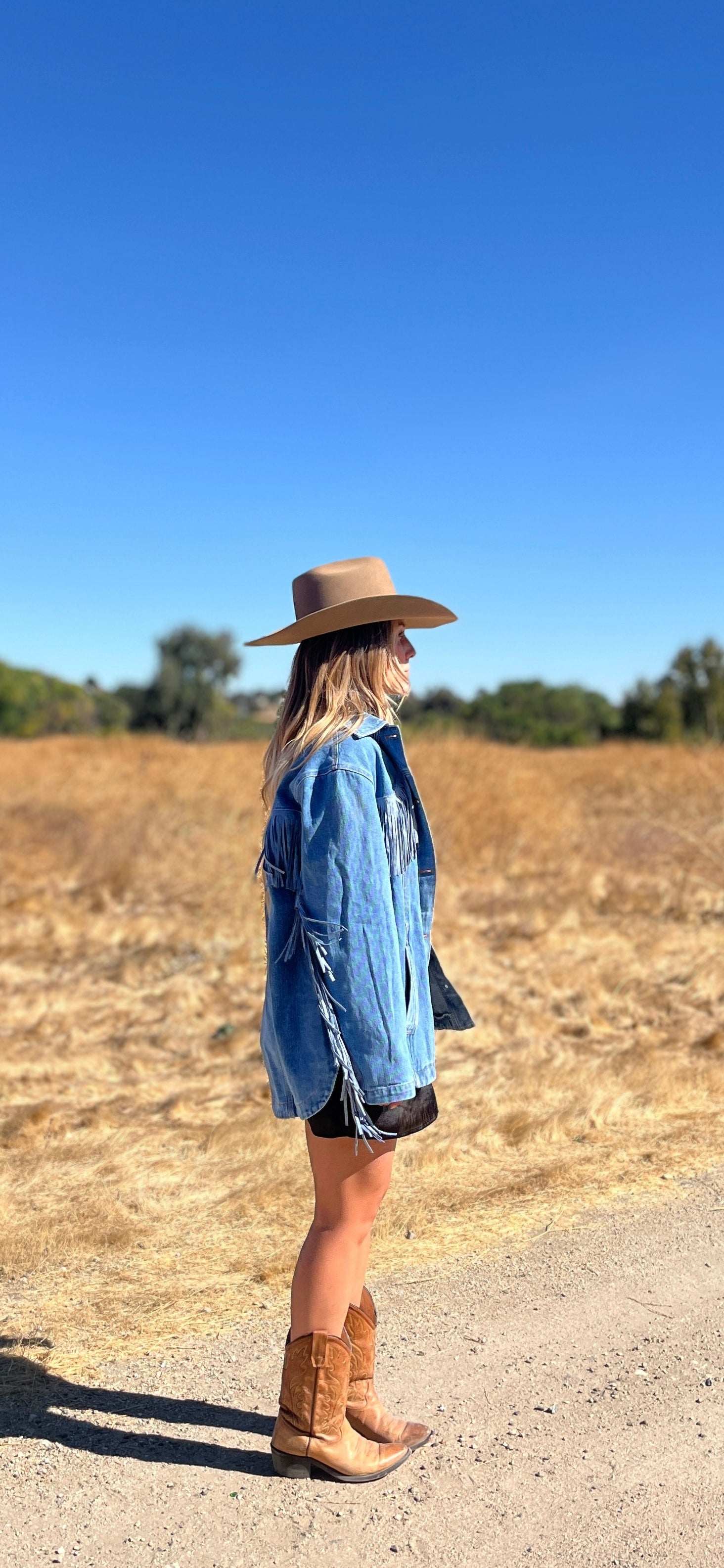 Denim, fringe jacket with playful hem and pockets. Available for pre-order. Notifications will be sent immediately upon shipment.