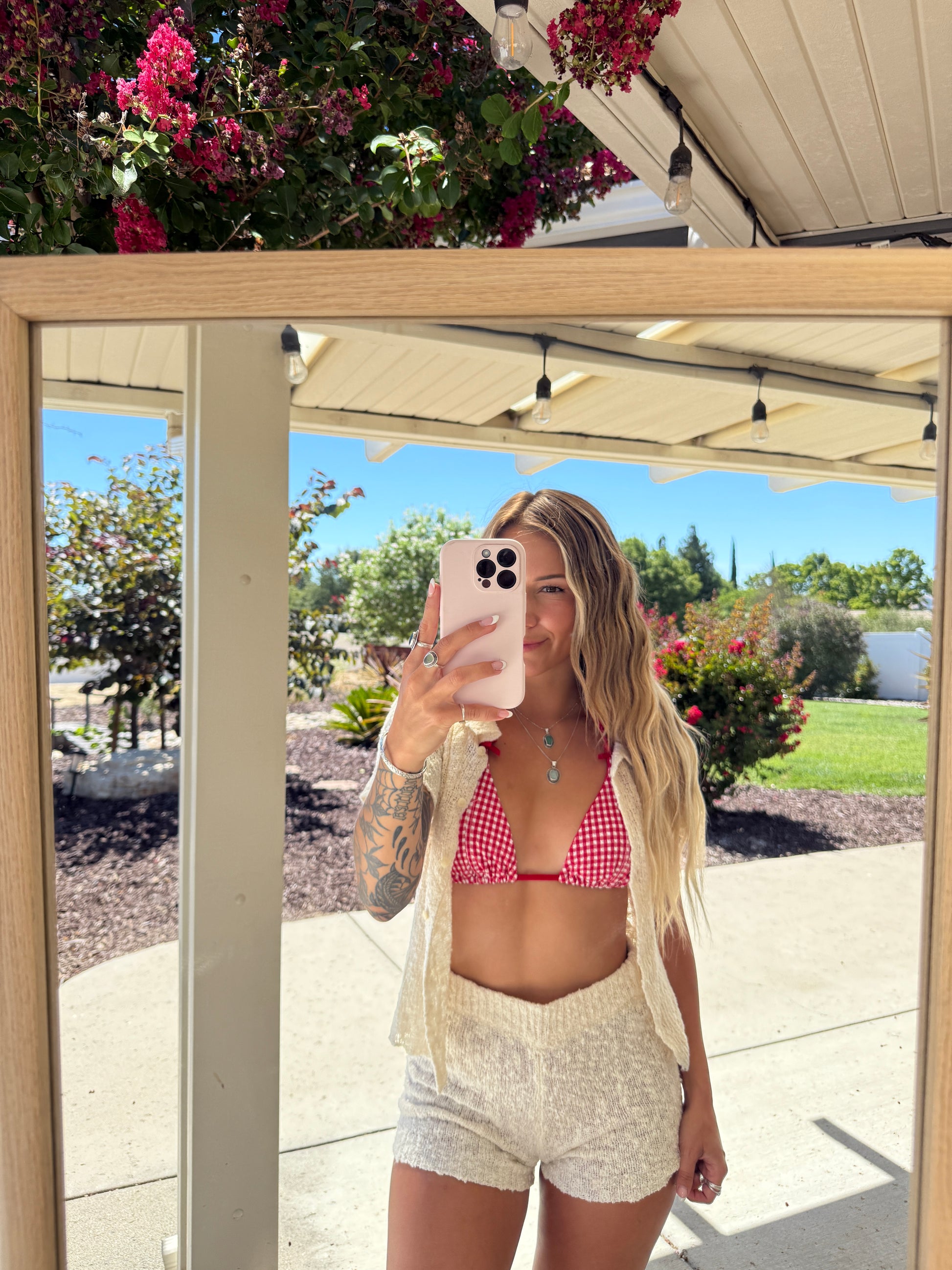 Boucle knit top and short set. Boucle knit. Button down top and elastic waist short. Made with a semi-sheer fabric, undergarments can show through. Model is wearing size S.